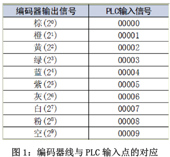 的線與PLC 輸入的點的對應圖,圖2 為NPN 輸出絕對值型E6C3-AG5C 的實際接線圖,紅色線接電源正極,黑色線接電源負極,褐色線接輸入0.00,橙色線接輸入0.01,黃色線接輸入0.02,綠色線接輸入0.03,藍色線接輸入0.04,紫色線接輸入0.05,灰色線接輸入0.06,白色線接輸入0.07,粉色線接輸入0.08,PLC 的COM 接電源正極。