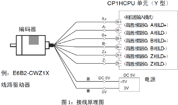 的接線原理,圖2 為實際接線圖,黑色線接A0+,黑紅鑲邊線A0-,白色線接B0+,白紅鑲邊線接B0-, 橙色線接Z0+,橙紅鑲邊線接Z0-,褐色線接電源+5V,藍色線接電源0V,切勿接線錯誤。